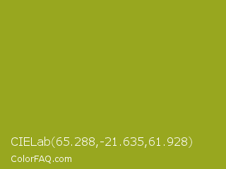 CIELab 65.288,-21.635,61.928 Color is a normal yellow color and the nearest color is Citron #9fa91f. Hex code #98a71f and RGB value is rgb(152,167,31). In RGB color space, this color is composed of 60% red, 65% green, 12% blue, In CMYK color space, this color is composed of 9% cyan, 0% magenta, 81% yellow , 35% black , In HSL color space, this color has a hue angle of 67° , 69% saturation and 39% lightness.