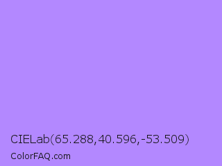 CIELab 65.288,40.596,-53.509 Color is a light violet color and the nearest color is Pale Violet #cc99ff. Hex code #b388ff and RGB value is rgb(179,136,255). In RGB color space, this color is composed of 70% red, 53% green, 100% blue, In CMYK color space, this color is composed of 30% cyan, 47% magenta, 0% yellow , 0% black , In HSL color space, this color has a hue angle of 262° , 100% saturation and 77% lightness.