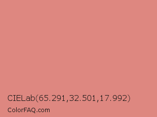 CIELab 65.291,32.501,17.992 Color is a light red color and the nearest color is New York Pink #d7837f. Hex code #de8780 and RGB value is rgb(222,135,128). In RGB color space, this color is composed of 87% red, 53% green, 50% blue, In CMYK color space, this color is composed of 0% cyan, 39% magenta, 42% yellow , 13% black , In HSL color space, this color has a hue angle of 4° , 59% saturation and 69% lightness.
