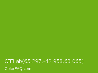 CIELab 65.297,-42.958,63.065 Color is a normal green color and the nearest color is Christi #67a712. Hex code #6eb016 and RGB value is rgb(110,176,22). In RGB color space, this color is composed of 43% red, 69% green, 9% blue, In CMYK color space, this color is composed of 38% cyan, 0% magenta, 88% yellow , 31% black , In HSL color space, this color has a hue angle of 86° , 78% saturation and 39% lightness.