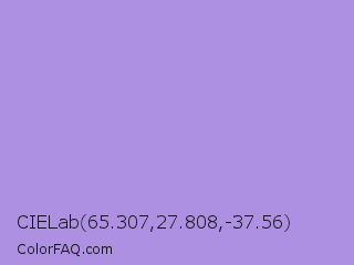 CIELab 65.307,27.808,-37.56 Color is a light violet color and the nearest color is Dull Lavender #a899e6. Hex code #ae90e2 and RGB value is rgb(174,144,226). In RGB color space, this color is composed of 68% red, 56% green, 89% blue, In CMYK color space, this color is composed of 23% cyan, 36% magenta, 0% yellow , 11% black , In HSL color space, this color has a hue angle of 262° , 59% saturation and 73% lightness.
