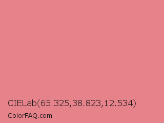 CIELab 65.325,38.823,12.534 Color is a light red color and the nearest color is Light Coral #f08080. Hex code #e5828a and RGB value is rgb(229,130,138). In RGB color space, this color is composed of 90% red, 51% green, 54% blue, In CMYK color space, this color is composed of 0% cyan, 43% magenta, 40% yellow , 10% black , In HSL color space, this color has a hue angle of 355° , 66% saturation and 70% lightness.