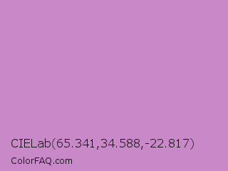 CIELab 65.341,34.588,-22.817 Color is a light magenta color and the nearest color is Pastel Violet #cb99c9. Hex code #c989c8 and RGB value is rgb(201,137,200). In RGB color space, this color is composed of 79% red, 54% green, 78% blue, In CMYK color space, this color is composed of 0% cyan, 32% magenta, 0% yellow , 21% black , In HSL color space, this color has a hue angle of 301° , 37% saturation and 66% lightness.