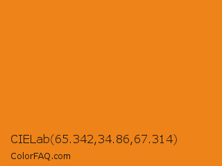CIELab 65.342,34.86,67.314 Color is a normal orange color and the nearest color is Zest #e5841b. Hex code #ee8319 and RGB value is rgb(238,131,25). In RGB color space, this color is composed of 93% red, 51% green, 10% blue, In CMYK color space, this color is composed of 0% cyan, 45% magenta, 89% yellow , 7% black , In HSL color space, this color has a hue angle of 30° , 86% saturation and 52% lightness.