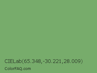CIELab 65.348,-30.221,28.009 Color is a normal green color and the nearest color is Bud Green #7bb661. Hex code #77ac6b and RGB value is rgb(119,172,107). In RGB color space, this color is composed of 47% red, 67% green, 42% blue, In CMYK color space, this color is composed of 31% cyan, 0% magenta, 38% yellow , 33% black , In HSL color space, this color has a hue angle of 109° , 28% saturation and 55% lightness.