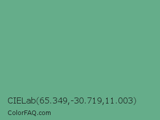 CIELab 65.349,-30.719,11.003 Color is a normal green color and the nearest color is Silver Tree #66b58f. Hex code #65ad8a and RGB value is rgb(101,173,138). In RGB color space, this color is composed of 40% red, 68% green, 54% blue, In CMYK color space, this color is composed of 42% cyan, 0% magenta, 20% yellow , 32% black , In HSL color space, this color has a hue angle of 151° , 31% saturation and 54% lightness.