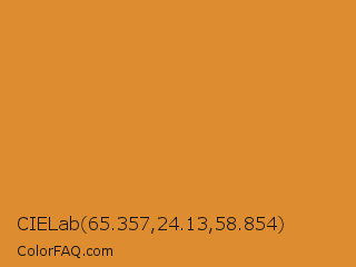 CIELab 65.357,24.13,58.854 Color is a normal orange color and the nearest color is Tigers Eye #e08d3c. Hex code #de8c30 and RGB value is rgb(222,140,48). In RGB color space, this color is composed of 87% red, 55% green, 19% blue, In CMYK color space, this color is composed of 0% cyan, 37% magenta, 78% yellow , 13% black , In HSL color space, this color has a hue angle of 32° , 73% saturation and 53% lightness.