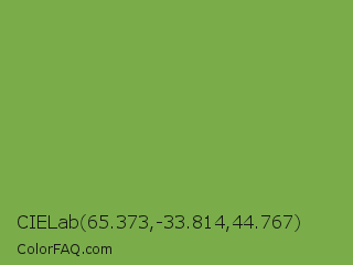 CIELab 65.373,-33.814,44.767 Color is a normal green color and the nearest color is Chelsea Cucumber #83aa5d. Hex code #7aad4a and RGB value is rgb(122,173,74). In RGB color space, this color is composed of 48% red, 68% green, 29% blue, In CMYK color space, this color is composed of 29% cyan, 0% magenta, 57% yellow , 32% black , In HSL color space, this color has a hue angle of 91° , 40% saturation and 48% lightness.