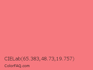CIELab 65.383,48.73,19.757 Color is a light red color and the nearest color is Froly #f57584. Hex code #f6787e and RGB value is rgb(246,120,126). In RGB color space, this color is composed of 96% red, 47% green, 49% blue, In CMYK color space, this color is composed of 0% cyan, 51% magenta, 49% yellow , 4% black , In HSL color space, this color has a hue angle of 357° , 88% saturation and 72% lightness.
