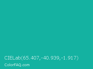 CIELab 65.407,-40.939,-1.917 Color is a normal cyan color and the nearest color is Light Sea Green #20b2aa. Hex code #14b2a1 and RGB value is rgb(20,178,161). In RGB color space, this color is composed of 8% red, 70% green, 63% blue, In CMYK color space, this color is composed of 89% cyan, 0% magenta, 10% yellow , 30% black , In HSL color space, this color has a hue angle of 174° , 80% saturation and 39% lightness.