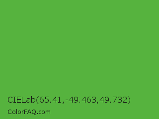 CIELab 65.41,-49.463,49.732 Color is a normal green color and the nearest color is Apple #4fa83d. Hex code #56b33e and RGB value is rgb(86,179,62). In RGB color space, this color is composed of 34% red, 70% green, 24% blue, In CMYK color space, this color is composed of 52% cyan, 0% magenta, 65% yellow , 30% black , In HSL color space, this color has a hue angle of 108° , 49% saturation and 47% lightness.