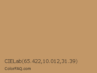 CIELab 65.422,10.012,31.39 Color is a normal orange color and the nearest color is Desert Camel #c19a6b. Hex code #c29767 and RGB value is rgb(194,151,103). In RGB color space, this color is composed of 76% red, 59% green, 40% blue, In CMYK color space, this color is composed of 0% cyan, 22% magenta, 47% yellow , 24% black , In HSL color space, this color has a hue angle of 32° , 43% saturation and 58% lightness.
