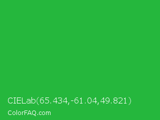 CIELab 65.434,-61.04,49.821 Color is a normal green color and the nearest color is Wageningen Green #34b233. Hex code #25b73d and RGB value is rgb(37,183,61). In RGB color space, this color is composed of 15% red, 72% green, 24% blue, In CMYK color space, this color is composed of 80% cyan, 0% magenta, 67% yellow , 28% black , In HSL color space, this color has a hue angle of 130° , 66% saturation and 43% lightness.