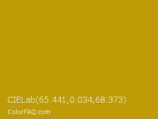 CIELab 65.441,0.034,68.373 Color is a normal yellow color and the nearest color is Buddha Gold #c1a004. Hex code #bd9c05 and RGB value is rgb(189,156,5). In RGB color space, this color is composed of 74% red, 61% green, 2% blue, In CMYK color space, this color is composed of 0% cyan, 17% magenta, 97% yellow , 26% black , In HSL color space, this color has a hue angle of 49° , 95% saturation and 38% lightness.