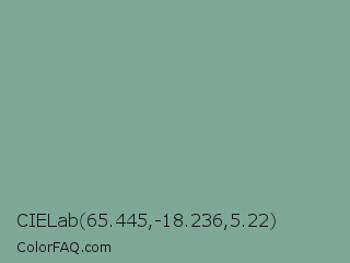 CIELab 65.445,-18.236,5.22 Color is a normal green color and the nearest color is Bay Leaf #7da98d. Hex code #7ea895 and RGB value is rgb(126,168,149). In RGB color space, this color is composed of 49% red, 66% green, 58% blue, In CMYK color space, this color is composed of 25% cyan, 0% magenta, 11% yellow , 34% black , In HSL color space, this color has a hue angle of 153° , 19% saturation and 58% lightness.