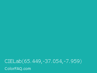 CIELab 65.449,-37.054,-7.959 Color is a normal cyan color and the nearest color is Light Sea Green #20b2aa. Hex code #18b1ac and RGB value is rgb(24,177,172). In RGB color space, this color is composed of 9% red, 69% green, 67% blue, In CMYK color space, this color is composed of 86% cyan, 0% magenta, 3% yellow , 31% black , In HSL color space, this color has a hue angle of 178° , 76% saturation and 39% lightness.