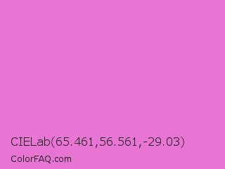 CIELab 65.461,56.561,-29.03 Color is a light magenta color and the nearest color is Orchid #da70d6. Hex code #e875d4 and RGB value is rgb(232,117,212). In RGB color space, this color is composed of 91% red, 46% green, 83% blue, In CMYK color space, this color is composed of 0% cyan, 50% magenta, 9% yellow , 9% black , In HSL color space, this color has a hue angle of 310° , 71% saturation and 68% lightness.