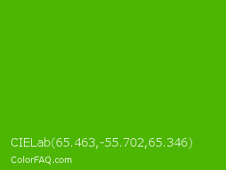 CIELab 65.463,-55.702,65.346 Color is a normal green color and the nearest color is Kelly Green #4cbb17. Hex code #4db504 and RGB value is rgb(77,181,4). In RGB color space, this color is composed of 30% red, 71% green, 2% blue, In CMYK color space, this color is composed of 57% cyan, 0% magenta, 98% yellow , 29% black , In HSL color space, this color has a hue angle of 95° , 96% saturation and 36% lightness.