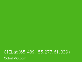 CIELab 65.489,-55.277,61.339 Color is a normal green color and the nearest color is Kelly Green #4cbb17. Hex code #4cb51c and RGB value is rgb(76,181,28). In RGB color space, this color is composed of 30% red, 71% green, 11% blue, In CMYK color space, this color is composed of 58% cyan, 0% magenta, 85% yellow , 29% black , In HSL color space, this color has a hue angle of 101° , 73% saturation and 41% lightness.
