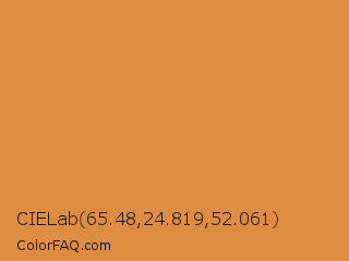 CIELab 65.48,24.819,52.061 Color is a normal orange color and the nearest color is Tigers Eye #e08d3c. Hex code #de8c40 and RGB value is rgb(222,140,64). In RGB color space, this color is composed of 87% red, 55% green, 25% blue, In CMYK color space, this color is composed of 0% cyan, 37% magenta, 71% yellow , 13% black , In HSL color space, this color has a hue angle of 29° , 71% saturation and 56% lightness.