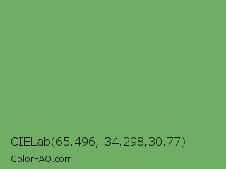 CIELab 65.496,-34.298,30.77 Color is a normal green color and the nearest color is Bud Green #7bb661. Hex code #70ae66 and RGB value is rgb(112,174,102). In RGB color space, this color is composed of 44% red, 68% green, 40% blue, In CMYK color space, this color is composed of 36% cyan, 0% magenta, 41% yellow , 32% black , In HSL color space, this color has a hue angle of 112° , 31% saturation and 54% lightness.