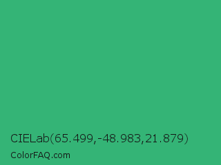CIELab 65.499,-48.983,21.879 Color is a normal green color and the nearest color is Medium Sea Green #3cb371. Hex code #34b476 and RGB value is rgb(52,180,118). In RGB color space, this color is composed of 20% red, 71% green, 46% blue, In CMYK color space, this color is composed of 71% cyan, 0% magenta, 34% yellow , 29% black , In HSL color space, this color has a hue angle of 151° , 55% saturation and 45% lightness.
