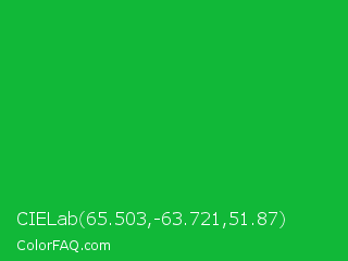 CIELab 65.503,-63.721,51.87 Color is a normal green color and the nearest color is Dark Pastel Green #03c03c. Hex code #11b838 and RGB value is rgb(17,184,56). In RGB color space, this color is composed of 7% red, 72% green, 22% blue, In CMYK color space, this color is composed of 91% cyan, 0% magenta, 70% yellow , 28% black , In HSL color space, this color has a hue angle of 134° , 83% saturation and 39% lightness.