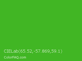CIELab 65.52,-57.869,59.1 Color is a normal green color and the nearest color is Kelly Green #4cbb17. Hex code #41b624 and RGB value is rgb(65,182,36). In RGB color space, this color is composed of 25% red, 71% green, 14% blue, In CMYK color space, this color is composed of 64% cyan, 0% magenta, 80% yellow , 29% black , In HSL color space, this color has a hue angle of 108° , 67% saturation and 43% lightness.