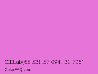 CIELab 65.531,57.094,-31.726 Color is a light magenta color and the nearest color is Orchid #da70d6. Hex code #e775d9 and RGB value is rgb(231,117,217). In RGB color space, this color is composed of 91% red, 46% green, 85% blue, In CMYK color space, this color is composed of 0% cyan, 49% magenta, 6% yellow , 9% black , In HSL color space, this color has a hue angle of 307° , 70% saturation and 68% lightness.