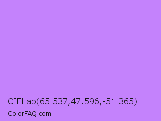 CIELab 65.537,47.596,-51.365 Color is a light purple color and the nearest color is Pale Violet #cc99ff. Hex code #c482fc and RGB value is rgb(196,130,252). In RGB color space, this color is composed of 77% red, 51% green, 99% blue, In CMYK color space, this color is composed of 22% cyan, 48% magenta, 0% yellow , 1% black , In HSL color space, this color has a hue angle of 272° , 95% saturation and 75% lightness.
