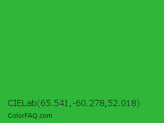 CIELab 65.541,-60.278,52.018 Color is a normal green color and the nearest color is Wageningen Green #34b233. Hex code #2eb738 and RGB value is rgb(46,183,56). In RGB color space, this color is composed of 18% red, 72% green, 22% blue, In CMYK color space, this color is composed of 75% cyan, 0% magenta, 69% yellow , 28% black , In HSL color space, this color has a hue angle of 124° , 60% saturation and 45% lightness.