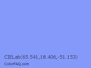 CIELab 65.541,18.406,-51.153 Color is a light blue color and the nearest color is Portage #8b9fee. Hex code #8599fb and RGB value is rgb(133,153,251). In RGB color space, this color is composed of 52% red, 60% green, 98% blue, In CMYK color space, this color is composed of 47% cyan, 39% magenta, 0% yellow , 2% black , In HSL color space, this color has a hue angle of 230° , 94% saturation and 75% lightness.