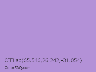 CIELab 65.546,26.242,-31.054 Color is a light violet color and the nearest color is Light Pastel Purple #b19cd9. Hex code #b391d7 and RGB value is rgb(179,145,215). In RGB color space, this color is composed of 70% red, 57% green, 84% blue, In CMYK color space, this color is composed of 17% cyan, 33% magenta, 0% yellow , 16% black , In HSL color space, this color has a hue angle of 269° , 47% saturation and 71% lightness.