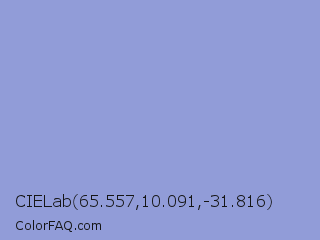 CIELab 65.557,10.091,-31.816 Color is a light blue color and the nearest color is Ceil #92a1cf. Hex code #919cd8 and RGB value is rgb(145,156,216). In RGB color space, this color is composed of 57% red, 61% green, 85% blue, In CMYK color space, this color is composed of 33% cyan, 28% magenta, 0% yellow , 15% black , In HSL color space, this color has a hue angle of 231° , 48% saturation and 71% lightness.