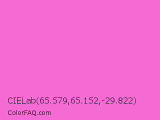 CIELab 65.579,65.152,-29.822 Color is a light magenta color and the nearest color is Rose Pink #ff66cc. Hex code #f56bd6 and RGB value is rgb(245,107,214). In RGB color space, this color is composed of 96% red, 42% green, 84% blue, In CMYK color space, this color is composed of 0% cyan, 56% magenta, 13% yellow , 4% black , In HSL color space, this color has a hue angle of 313° , 87% saturation and 69% lightness.