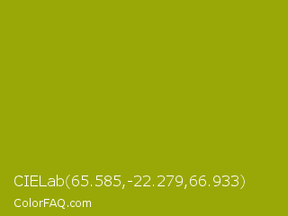 CIELab 65.585,-22.279,66.933 Color is a normal yellow color and the nearest color is Apple Green #8db600. Hex code #99a806 and RGB value is rgb(153,168,6). In RGB color space, this color is composed of 60% red, 66% green, 2% blue, In CMYK color space, this color is composed of 9% cyan, 0% magenta, 96% yellow , 34% black , In HSL color space, this color has a hue angle of 66° , 93% saturation and 34% lightness.