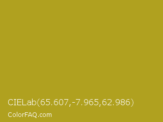 CIELab 65.607,-7.965,62.986 Color is a normal yellow color and the nearest color is Lucky #af9f1c. Hex code #b0a11f and RGB value is rgb(176,161,31). In RGB color space, this color is composed of 69% red, 63% green, 12% blue, In CMYK color space, this color is composed of 0% cyan, 9% magenta, 82% yellow , 31% black , In HSL color space, this color has a hue angle of 54° , 70% saturation and 41% lightness.