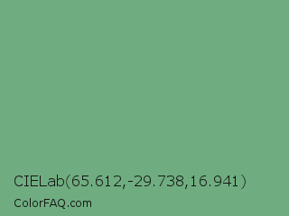 CIELab 65.612,-29.738,16.941 Color is a normal green color and the nearest color is Iguana Green #71bc78. Hex code #6fad80 and RGB value is rgb(111,173,128). In RGB color space, this color is composed of 44% red, 68% green, 50% blue, In CMYK color space, this color is composed of 36% cyan, 0% magenta, 26% yellow , 32% black , In HSL color space, this color has a hue angle of 136° , 27% saturation and 56% lightness.