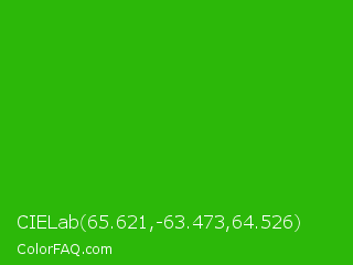 CIELab 65.621,-63.473,64.526 Color is a normal green color and the nearest color is Kelly Green #4cbb17. Hex code #2cb809 and RGB value is rgb(44,184,9). In RGB color space, this color is composed of 17% red, 72% green, 4% blue, In CMYK color space, this color is composed of 76% cyan, 0% magenta, 95% yellow , 28% black , In HSL color space, this color has a hue angle of 108° , 91% saturation and 38% lightness.
