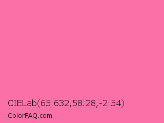 CIELab 65.632,58.28,-2.54 Color is a light rose color and the nearest color is Cyclamen #f56fa1. Hex code #fb70a6 and RGB value is rgb(251,112,166). In RGB color space, this color is composed of 98% red, 44% green, 65% blue, In CMYK color space, this color is composed of 0% cyan, 55% magenta, 34% yellow , 2% black , In HSL color space, this color has a hue angle of 337° , 95% saturation and 71% lightness.