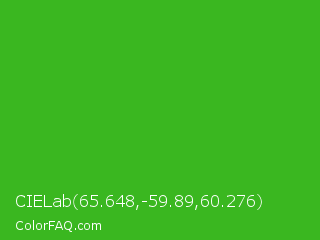 CIELab 65.648,-59.89,60.276 Color is a normal green color and the nearest color is Kelly Green #4cbb17. Hex code #3ab720 and RGB value is rgb(58,183,32). In RGB color space, this color is composed of 23% red, 72% green, 13% blue, In CMYK color space, this color is composed of 68% cyan, 0% magenta, 83% yellow , 28% black , In HSL color space, this color has a hue angle of 110° , 70% saturation and 42% lightness.