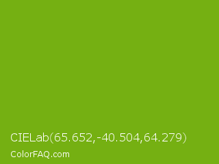 CIELab 65.652,-40.504,64.279 Color is a normal green color and the nearest color is Lima #76bd17. Hex code #75b012 and RGB value is rgb(117,176,18). In RGB color space, this color is composed of 46% red, 69% green, 7% blue, In CMYK color space, this color is composed of 34% cyan, 0% magenta, 90% yellow , 31% black , In HSL color space, this color has a hue angle of 82° , 81% saturation and 38% lightness.