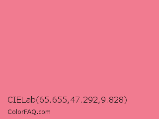 CIELab 65.655,47.292,9.828 Color is a light red color and the nearest color is Froly #f57584. Hex code #f17b90 and RGB value is rgb(241,123,144). In RGB color space, this color is composed of 95% red, 48% green, 56% blue, In CMYK color space, this color is composed of 0% cyan, 49% magenta, 40% yellow , 5% black , In HSL color space, this color has a hue angle of 349° , 81% saturation and 71% lightness.