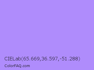 CIELab 65.669,36.597,-51.288 Color is a light indigo color and the nearest color is Dull Lavender #a899e6. Hex code #af8cfc and RGB value is rgb(175,140,252). In RGB color space, this color is composed of 69% red, 55% green, 99% blue, In CMYK color space, this color is composed of 31% cyan, 44% magenta, 0% yellow , 1% black , In HSL color space, this color has a hue angle of 259° , 95% saturation and 77% lightness.