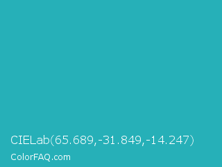 CIELab 65.689,-31.849,-14.247 Color is a normal cyan color and the nearest color is Light Sea Green #20b2aa. Hex code #26b0b8 and RGB value is rgb(38,176,184). In RGB color space, this color is composed of 15% red, 69% green, 72% blue, In CMYK color space, this color is composed of 79% cyan, 4% magenta, 0% yellow , 28% black , In HSL color space, this color has a hue angle of 183° , 66% saturation and 44% lightness.