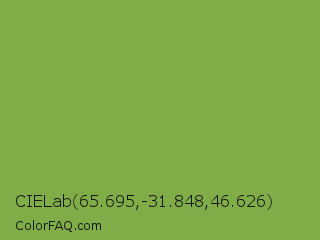 CIELab 65.695,-31.848,46.626 Color is a normal green color and the nearest color is Sushi #87ab39. Hex code #80ad47 and RGB value is rgb(128,173,71). In RGB color space, this color is composed of 50% red, 68% green, 28% blue, In CMYK color space, this color is composed of 26% cyan, 0% magenta, 59% yellow , 32% black , In HSL color space, this color has a hue angle of 86° , 42% saturation and 48% lightness.