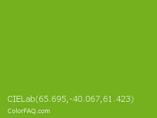 CIELab 65.695,-40.067,61.423 Color is a normal green color and the nearest color is Lima #76bd17. Hex code #75b01f and RGB value is rgb(117,176,31). In RGB color space, this color is composed of 46% red, 69% green, 12% blue, In CMYK color space, this color is composed of 34% cyan, 0% magenta, 82% yellow , 31% black , In HSL color space, this color has a hue angle of 84° , 70% saturation and 41% lightness.