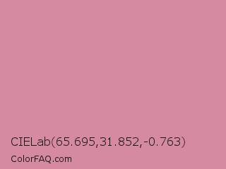 CIELab 65.695,31.852,-0.763 Color is a light rose color and the nearest color is Can Can #d591a4. Hex code #d58aa2 and RGB value is rgb(213,138,162). In RGB color space, this color is composed of 84% red, 54% green, 64% blue, In CMYK color space, this color is composed of 0% cyan, 35% magenta, 24% yellow , 16% black , In HSL color space, this color has a hue angle of 341° , 47% saturation and 69% lightness.