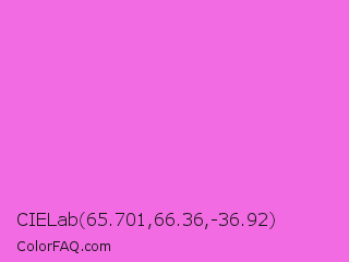 CIELab 65.701,66.36,-36.92 Color is a light magenta color and the nearest color is Lavender Magenta #ee82ee. Hex code #f26be3 and RGB value is rgb(242,107,227). In RGB color space, this color is composed of 95% red, 42% green, 89% blue, In CMYK color space, this color is composed of 0% cyan, 56% magenta, 6% yellow , 5% black , In HSL color space, this color has a hue angle of 307° , 84% saturation and 68% lightness.