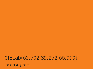 CIELab 65.702,39.252,66.919 Color is a normal orange color and the nearest color is Princeton Orange #f58025. Hex code #f5801d and RGB value is rgb(245,128,29). In RGB color space, this color is composed of 96% red, 50% green, 11% blue, In CMYK color space, this color is composed of 0% cyan, 48% magenta, 88% yellow , 4% black , In HSL color space, this color has a hue angle of 28° , 92% saturation and 54% lightness.
